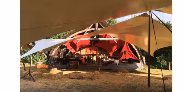 Soundcheck am Vorabend: Die Bühne steht, das Tarp auch, Ton klingt gut!