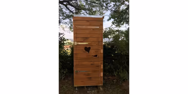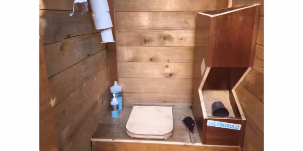 Mehrere neu gebaute Komposttoiletten auf dem Gelände: